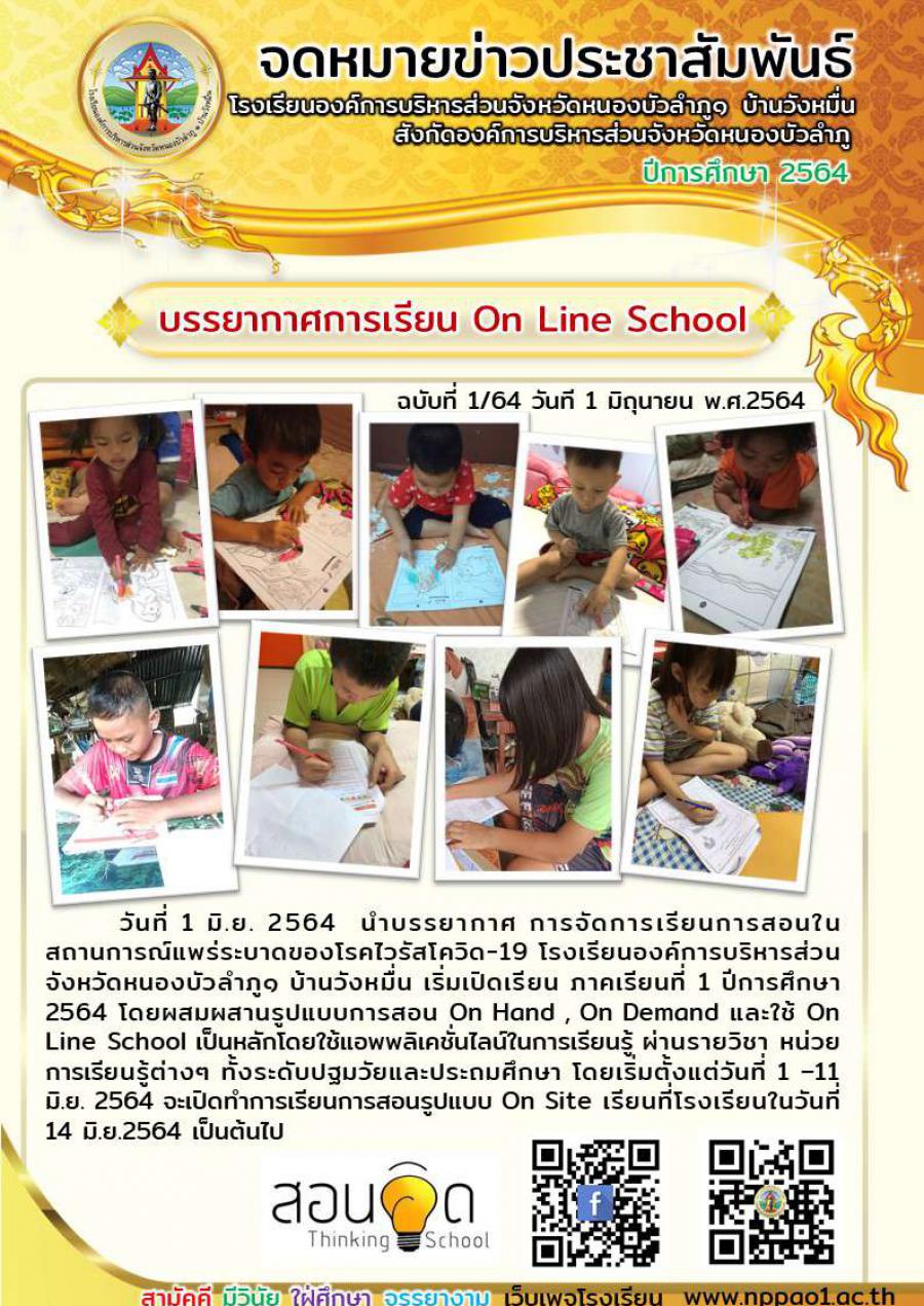 วันที่ 1 มิ.ย. 2564 นำบรรยากาศ การจัดการเรียนการสอนในสถานการณ์แพร่ระบาดของโรคไวรัสโควิด-19 โรงเรียนองค์การบริหารส่วนจังหวัดหนองบัวลำภู๑ บ้านวังหมื่น เริ่มเปิดเรียน ภาคเรียนที่ 1 ปีการศึกษา 2564 โดยผสมผสานรูปแบบการสอน On Hand , On Demand และใช้ On Line School เป็นหลักโดยใช้แอพพลิเคชั่นไลน์ในการเรียนรู้ ผ่านรายวิชา หน่วยการเรียนรู้ต่างๆ ทั้งระดับปฐมวัยและประถมศึกษา โดยเริ่มตั้งแต่วันที่ 1 –11 มิ.ย. 2564 จะเปิดทำการเรียนการสอนรูปแบบ On Site เรียนที่โรงเรียนในวันที่ 14 มิ.ย.2564 เป็นต้นไป