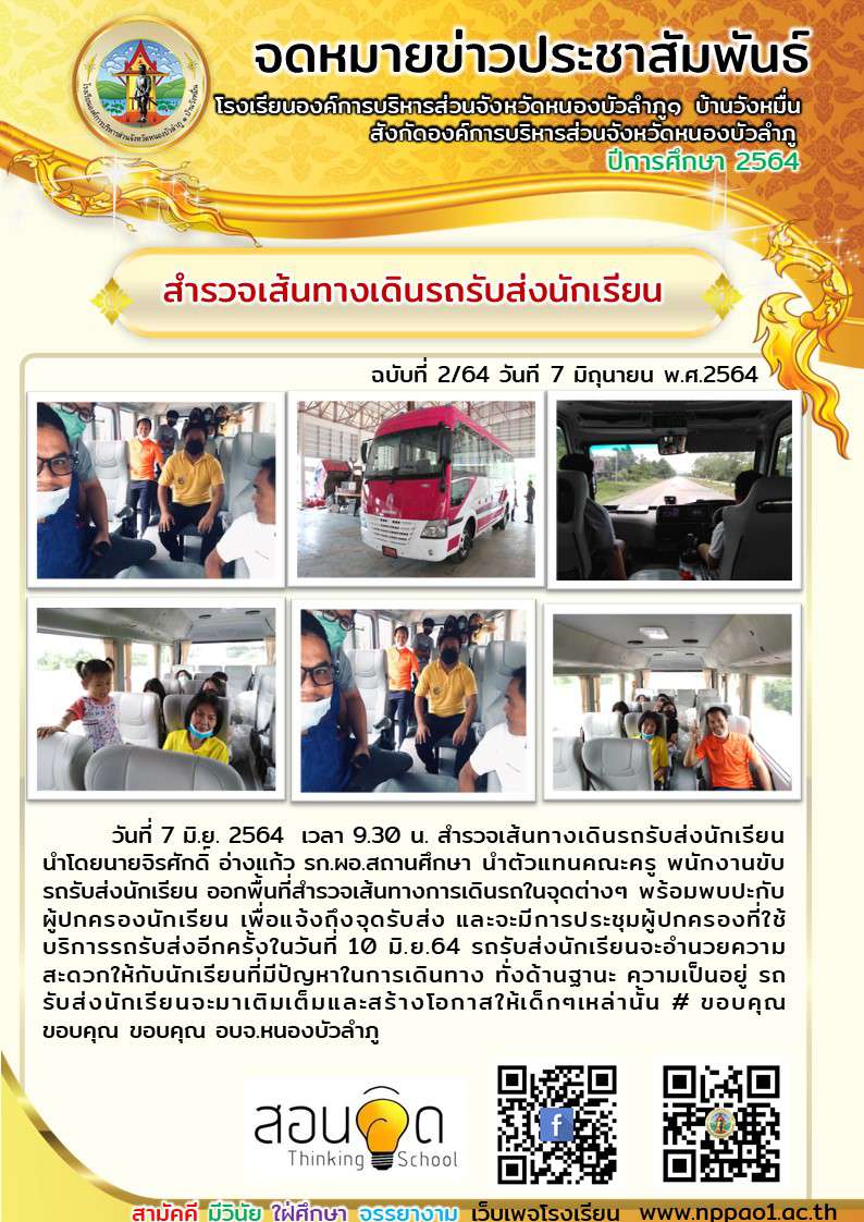วันที่ 7 มิ.ย. 2564 เวลา 9.30 น. สำรวจเส้นทางเดินรถรับส่งนักเรียน นำโดยนายจิรศักดิ์ อ่างแก้ว รก.ผอ.สถานศึกษา นำตัวแทนคณะครู พนักงานขับรถรับส่งนักเรียน ออกพื้นที่สำรวจเส้นทางการเดินรถในจุดต่างๆ พร้อมพบปะกับผู้ปกครองนักเรียน เพื่อแจ้งถึงจุดรับส่ง และจะมีการประชุมผู้ปกครองที่ใช้บริการรถรับส่งอีกครั้งในวันที่ 10 มิ.ย.64 รถรับส่งนักเรียนจะอำนวยความสะดวกให้กับนักเรียนที่มีปัญหาในการเดินทาง ทั่งด้านฐานะ ความเป็นอยู่ รถรับส่งนักเรียนจะมาเติมเต็มและสร้างโอกาสให้เด็กๆเหล่านั้น # ขอบคุณ ขอบคุณ ขอบคุณ อบจ.หนองบัวลำภู