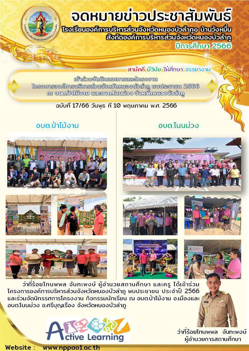 ฉบับที่ 17/2566 วันที่ 10 พฤษภาคม 2566 #เข้าร่วมจัดนิทรรศการและโครงงานโครงการองค์การบริหารจังหวัดหนองบัวลำภู พบประชาชน 2566 ณ.อบตป่าไม้งาม จ.หนองบัวลำภู