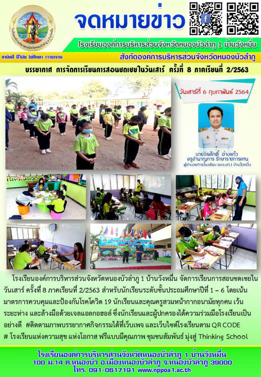 โรงเรียนองค์การบริหารส่วนจังหวัดหนองบัวลำภู 1 บ้านวังหมื่น จัดการเรียนการสอนชดเชยในวันเสาร์ ครั้งที่ 8 ภาคเรียนที่ 2/2563 สำหรับนักเรียนระดับชั้นประถมศึกษาปีที่ 1 – 6 โดยเน้นมาตรการควบคุมและป้องกันโรคโควิด 19 นักเรียนและคุณครูสวมหน้ากากอนามัยทุกคน เว้นระยะห่าง และล้างมือด้วยเจลแอลกอฮอล์ ซึ่งนักเรียนและผู้ปกครองได้ความร่วมมือโรงเรียนเป็นอย่างดี #ติดตามภาพบรรยากาศกิจกรรมได้ที่เว็บเพจ และเว็บไซต์โรงเรียนตาม QR CODE